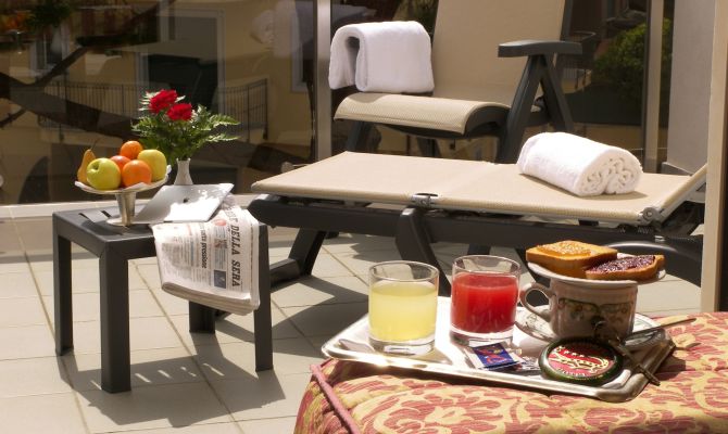Con letto matrimoniale o due singoli a richiesta. Dotata di minibar, aria condizionata, parquet, materassi ortopedici, Wi-Fi, TV a schermo piatto, bagno completo di lucernario a soffitto, asciugacapelli, set di cortesia e vasca con doccino. La camera dispone di spazioso terrazzo privato con vista giardino/piscina con tenda da sole motorizzata, lettino e sedia sdraio.